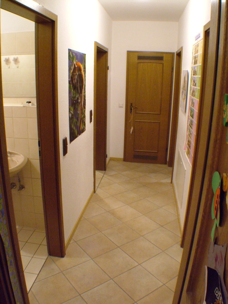 Über den Flur gelangt man in den hinteren Teil der Wohnung (Bäder, Schlaf und Kinderzimmer, Wäschekammer). Ganz nach Geschmack läßt sich der hintere Teil mit einer Tür trennen oder nicht.