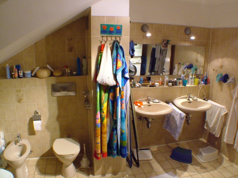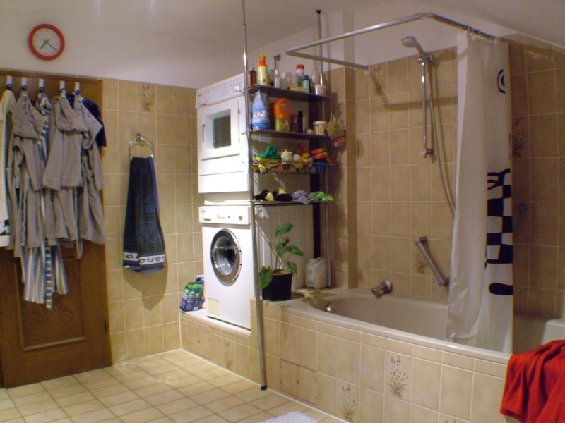 Das große Familienbad verfügt über Doppelwaschbecken, Toilette und Bidet, Badewanne und Duschecke. Wir haben es allerdings vorgezogen, die Duschecke für Waschmaschine und Trockner zu verwenden, statt diese in den großen aber entfernten Waschkeller zu stellen. |